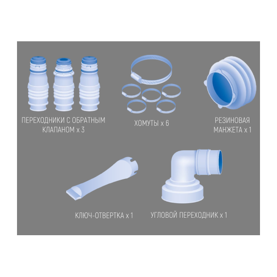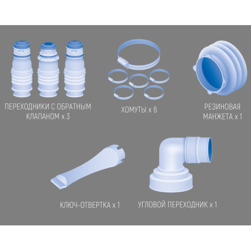 Комплект поставки: Переходники с обратным клапаном – 3 шт; Заглушка и уплотнение – 1 шт; Хомуты – 6 шт; Ключ-отвертка - 1 шт; Резиновая манжета 110 мм – 1 шт; Угловой переходник – 1 шт