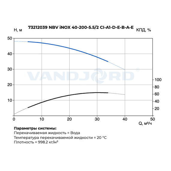 Max напор:48 м Max расход:40 м³/ч Диапазон температуры жидкости:-20 .. 120 °C Допустимое давление фланцев:PN 10 Защита электродвигателя:PTC Класс изоляции (IEC 85):F Класс энергоэффективности (EEI):IE3 Количество полюсов:2 Корпус:Нерж. сталь (AISI 304) КПД двигателя:0,892 Мощность:5.5 кВт Номинальная мощность - P2:5,5 кВт Номинальная скорость:2900 об/мин Номинальное напряжение:3х380D/660Y В (50 Гц) Номинальный диаметр рабочего колеса:200 мм Номинальный напор:41 м Номинальный расход:25 м³/ч Номинальный ток:10,6/6,1 A Подшипник:NSK Положение напорного патрубка:Вертикальное Преобразователь частоты:52111008 Рабочее колесо:Нерж. сталь (AISI 304) Размер всасывающего патрубка:DN 65 Размер напорного патрубка:DN 40 Расположение при монтаже:Горизонтальное Стандарт трубного присоединения:DIN Стандарт электродвигателя:IEC Степень защиты (IEC 34-5):IP55 Температура окружающей среды:-20°С .. 50°С Температура хранения:-10 .. 40 °C Тип установки уплотнения:Одинарное Типоразмер электродвигателя:132S1 Уплотнение вала:EPDM-Sic-Sic Шкаф управления 1-м насосом:51541008 Шкаф управления 2-мя насосами:51541011 Max рабочее давление:10 Cos φ:0,88