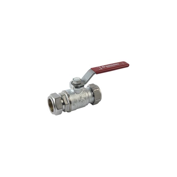 Кран шаровой с компрессионным соединением GIACOMINI R258CC (артикул R258CX005) — профессиональная итальянская арматура для систем отопления и водоснабжения. Кран шаровой со стандартным проходом, с обжимными переходниками для подсоединения металлической трубы, с накидными гайками, с красной рычажной рукояткой.