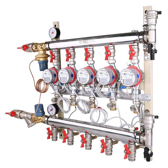 Узел этажный для поквартирного учета тепловой энергии с автоматическим регулятором перепада давлений 1" 6 вых. ввод слева VALTEC VT.GPA.06S04.L6